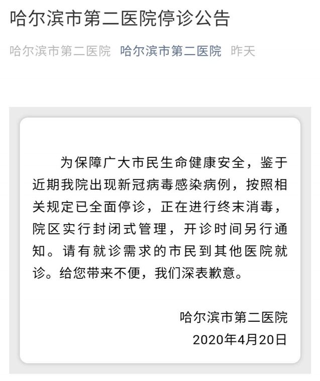 4月20日,哈尔滨市第二医院在其微信公众号发布停诊公告。