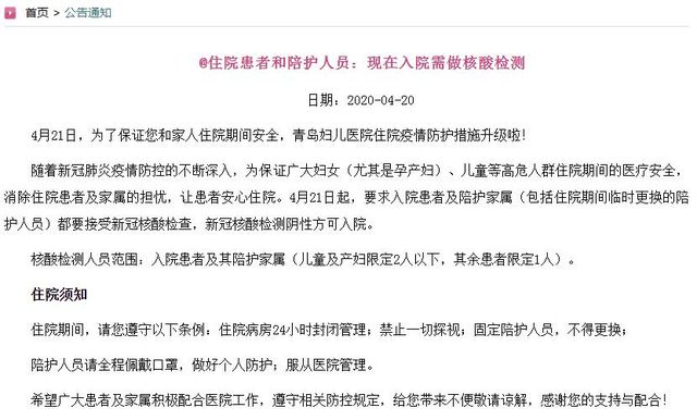 除此之外,青岛妇女儿童医院要求住院患者和陪护人员入院均需做核酸检测。