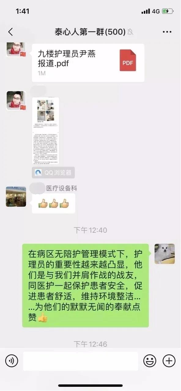 2020年5月19日,泰达国际心血管病医院内科护士长赵雪光在医院微信群中发布了篇《爱心、真心、贴心、耐心丨一位优秀护理员的日常》文章,高度肯定了泰心康护护理员尹燕在工作中的兢兢业业、无微不至。