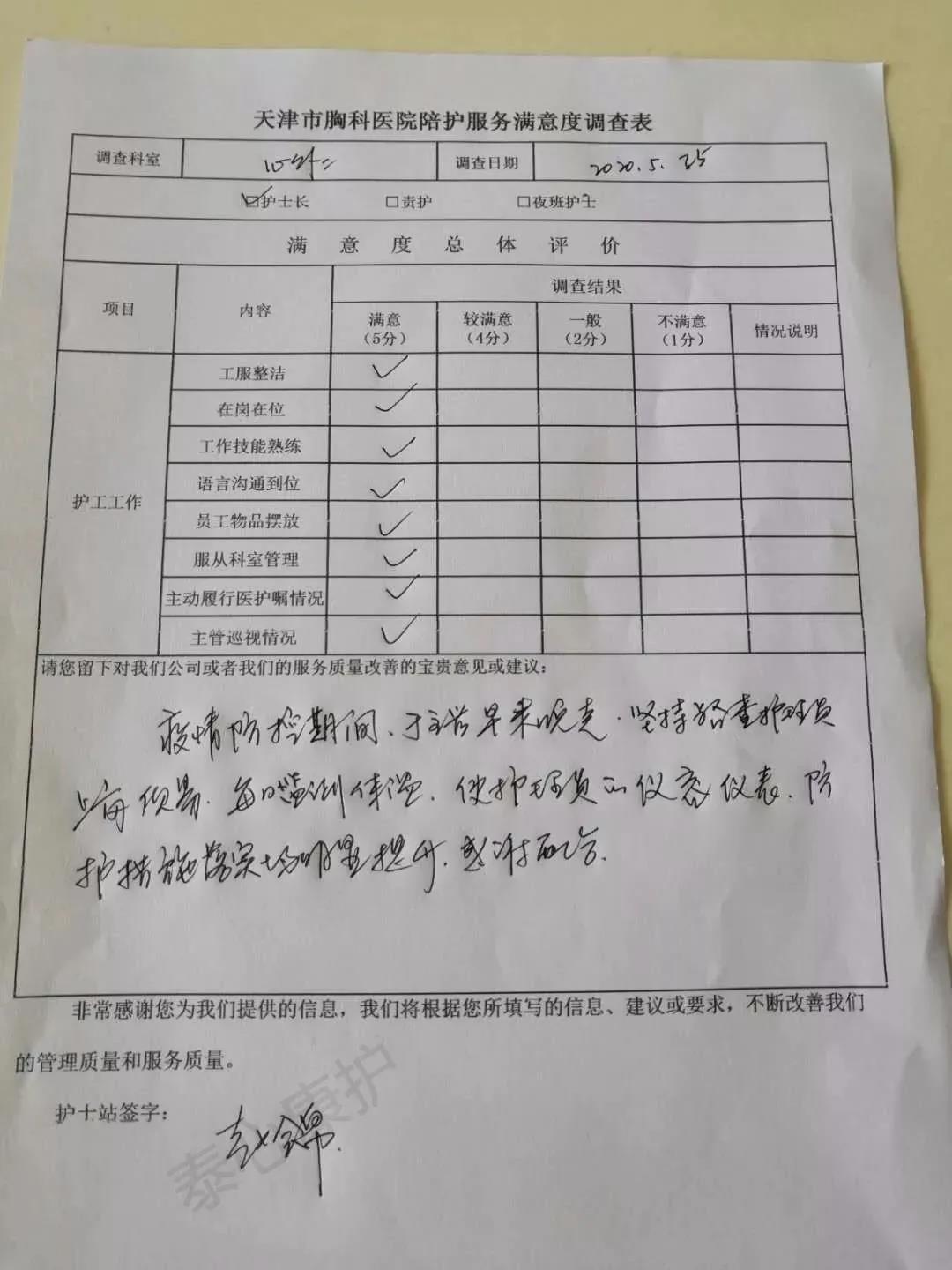 心外二科护士长赵锦在“陪护服务满意度调查表”中对护理员工服整洁、工作技能熟练、语言沟通到位、服从科室管理等8个方面均满分评价,并在“服务质量改善的意见或建议”一栏中写到:“疫情防控期间,于润芳主管早来晚走,坚持督查护理员上岗质量,每日检测体温,使护理员的仪容仪表、防控措施落实均明显提升,感谢配合。”短短的几句话,不仅是对泰心康护天津胸科医院项目主管于润芳的认可,更是对我们天津市胸科医院项目团队肯定与鼓励!