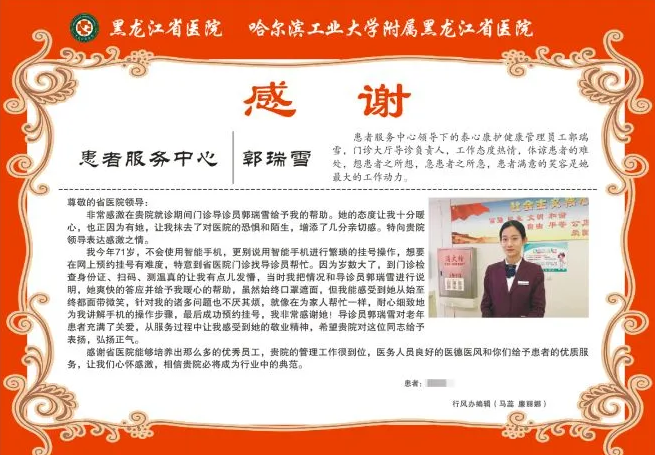 2020年2月起,黑龙江省医院响应省里要求,患者及家属就诊必须扫龙江健康码,填写网上医院的就诊信息,这可难坏了年龄较大的患者,郭瑞雪和她的导诊姐妹们,每天手把手的帮助患者及家属挂号、付款等操作,耐心细致的服务,得到了广大患者的高度赞誉。