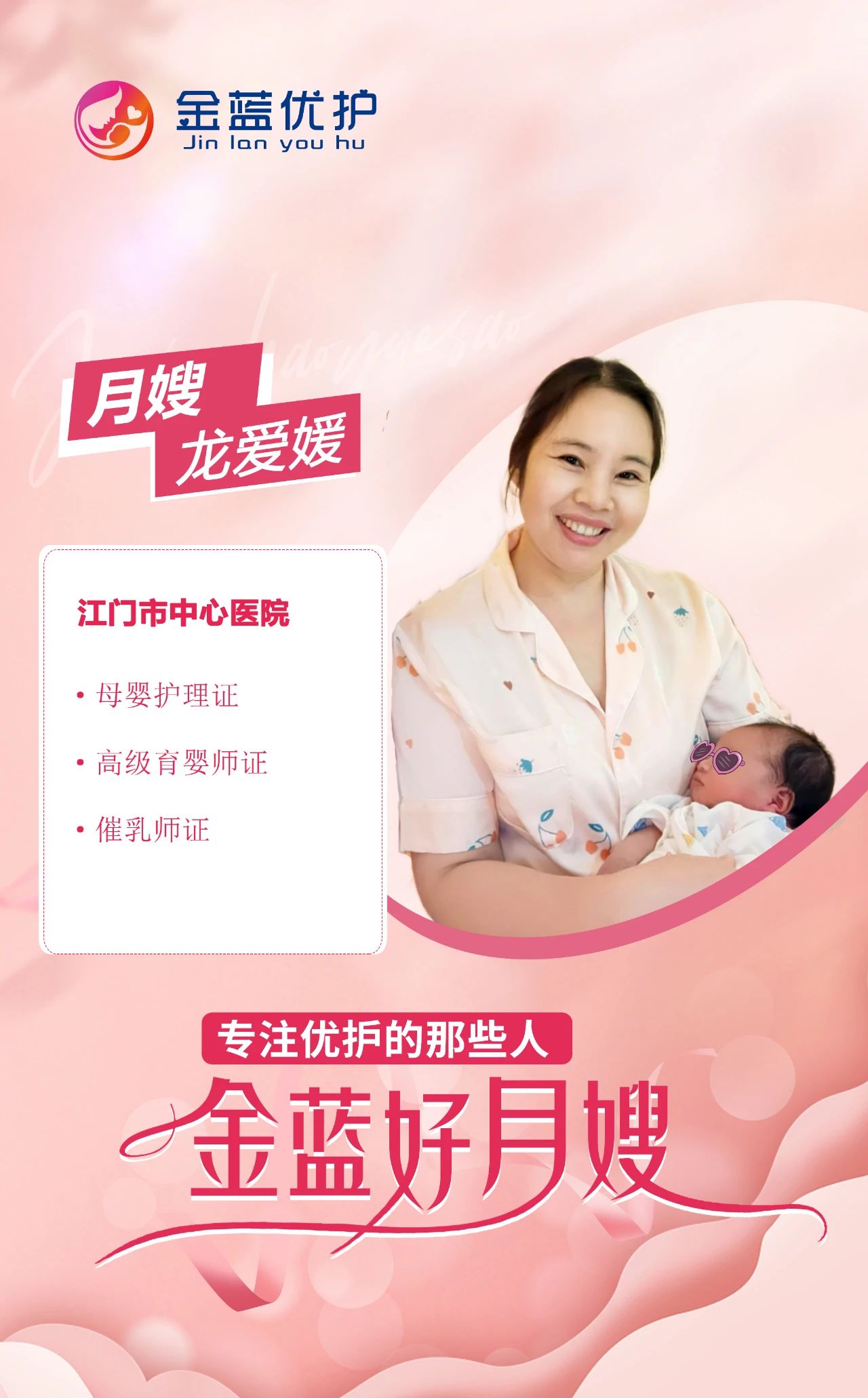 “每每看着宝宝在我的用心呵护下健康茁壮成长,宝妈渐渐康复,我都会觉得很有成就感,也是我前行最大的动力。尽心,尽责服务每个新生儿家庭是我从事月嫂这个职业的坚守。我很感谢领导、同事和客户对我的鼓励,今后我也会在江门中心医院继续服务更多的天使宝宝和可爱的宝妈们,我始终相信带着爱用心去服务好每一个家庭,我也会得到无尽的爱。”——龙爱媛